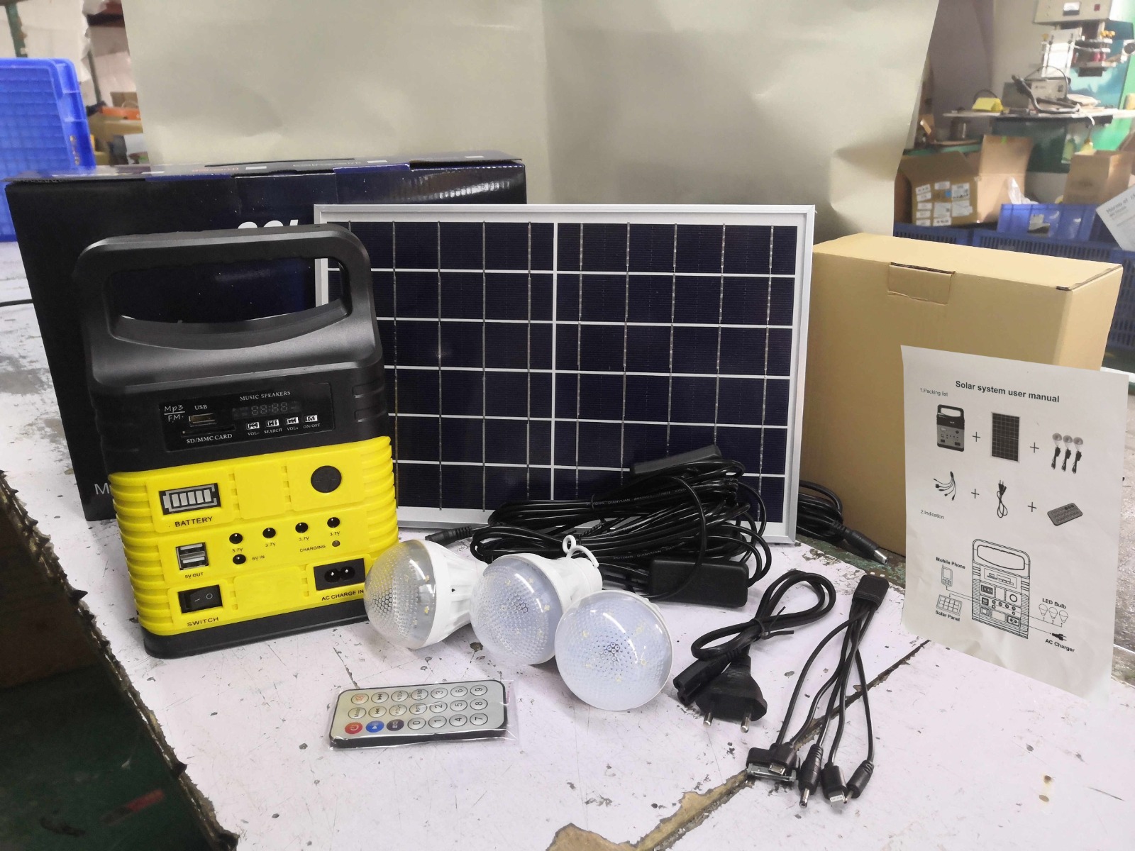 Portable solar kit with a 4 W panel, built‑in battery, 3 LED bulbs, USB charging, perfect for off-grid lighting, camping, reading, and quick emergency use.